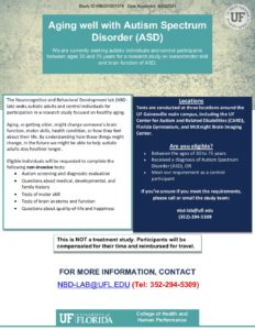 The primary benefit of these studies is to increase our understanding of aging associated behavioral and brain changes in ASD, especially in the adult population. Our findings will inform future therapies, diagnostic processes, support and caring for middle and old aged autistic adults.