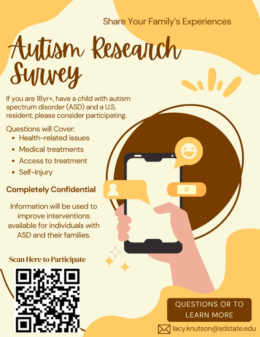 The current study is being conducted by Drs. Knutson, Viskupic, and Wiltse from South Dakota State University. This is a collaborative initiative to gain insight into various areas impacting the autism community. Dr. Knutson is a clinician having worked with autistic individuals and families for 15+ years. Drs. Viskupic and Wiltse are political scientists who examine attitudes and behaviors surrounding the COVID-19 pandemic.