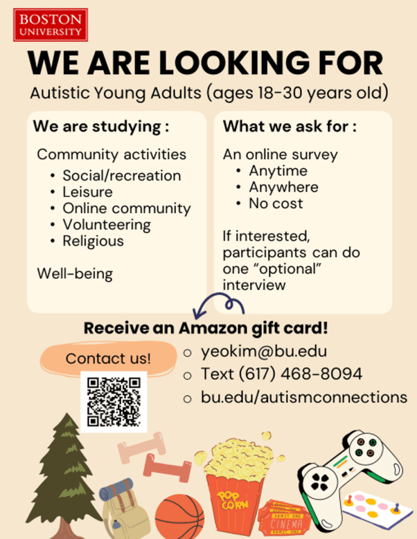 Boston University researchers are studying how autistic young adults do community activities, such as social and recreation, leisure, and/or volunteering activities. They also want to learn your thoughts on how community activities relate to your well-being.