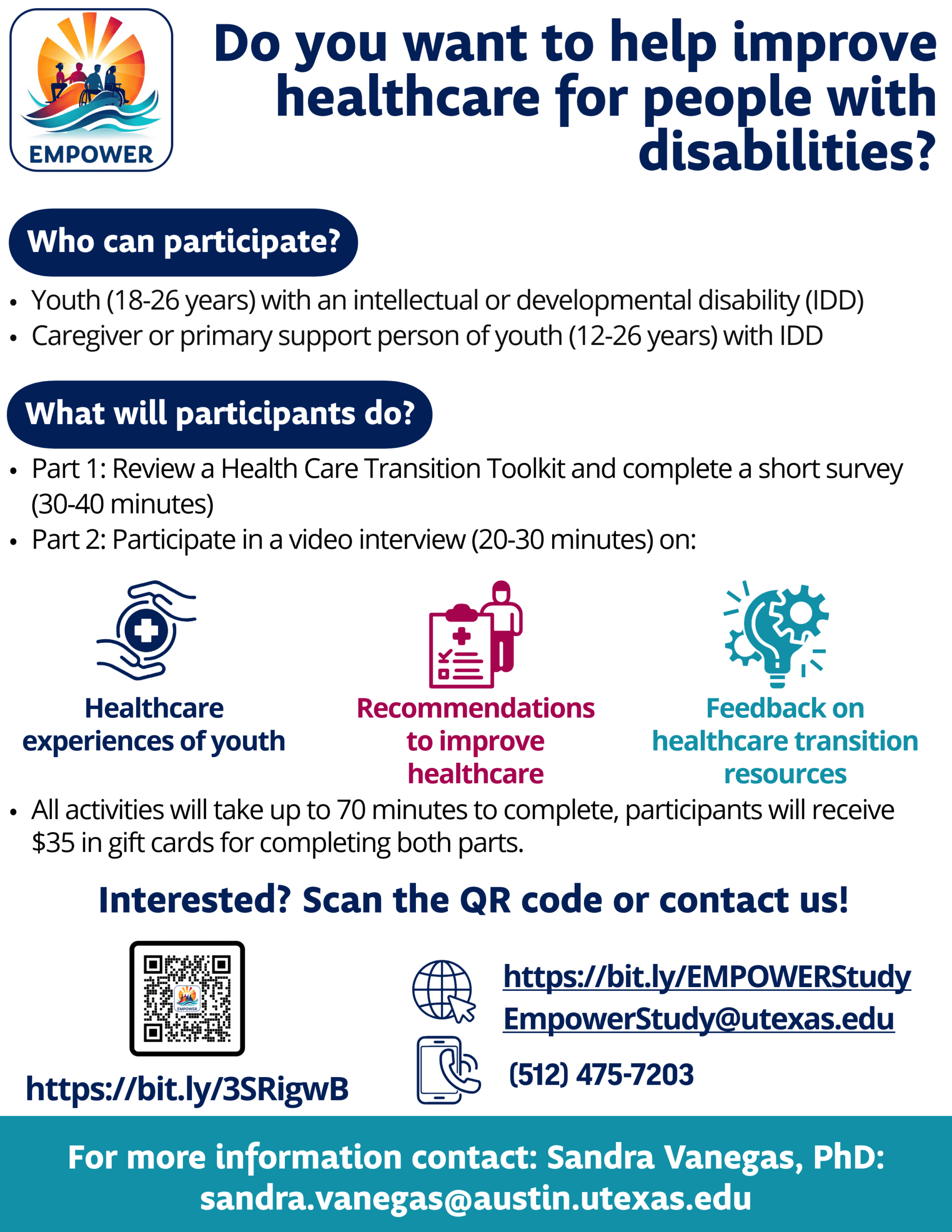 When youth with IDD enter adulthood, many changes take place that affect the continuation of their health care. Many youth have to change doctors, go to new medical offices, and learn more about their own healthcare. We would like to learn more about individuals’ lived experiences in navigating healthcare transitions to develop resources, programs, and supports that can better prepare youth with IDD and their caregivers with healthcare transitions.