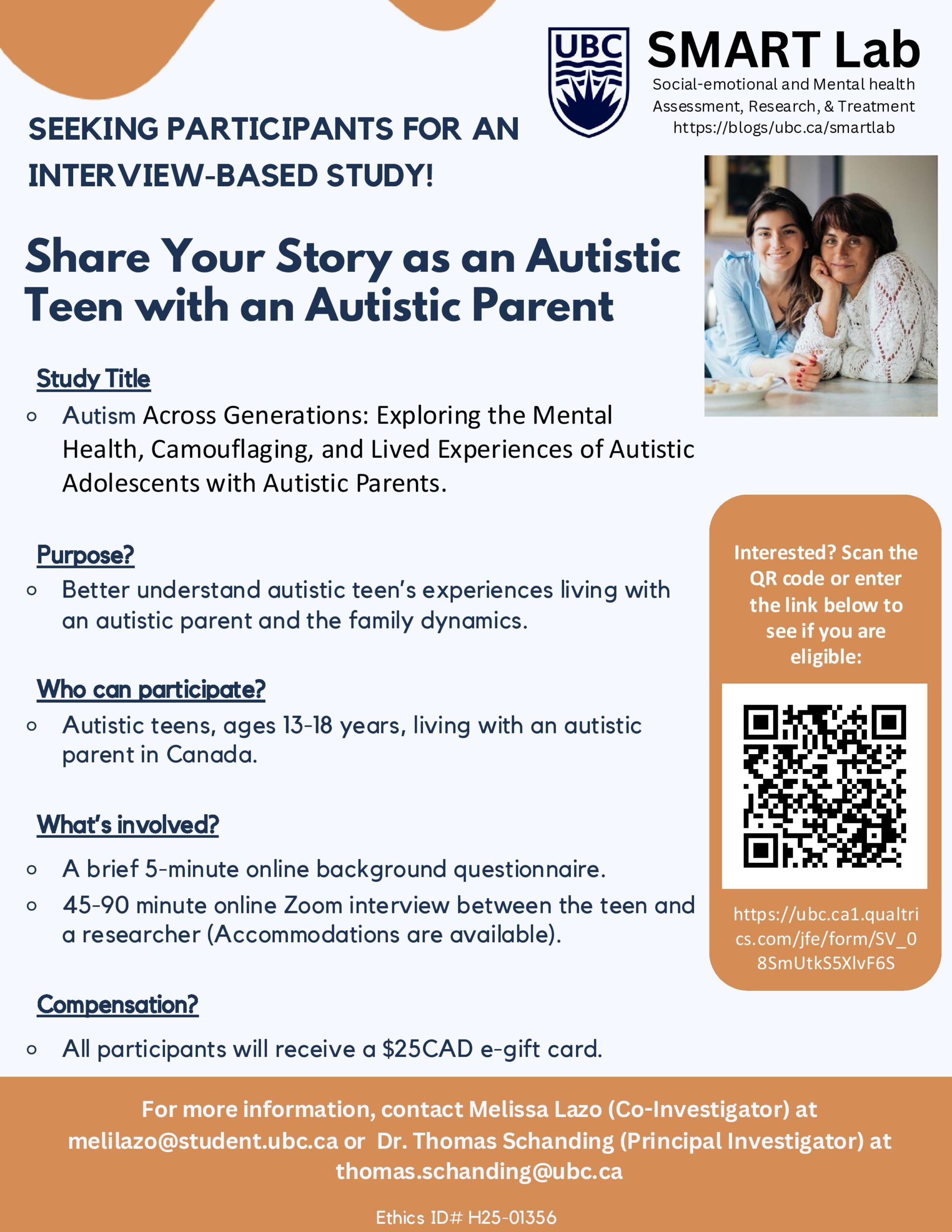 We are conducting an interview-based study to better understand autistic teens’ experiences living with an autistic parent.