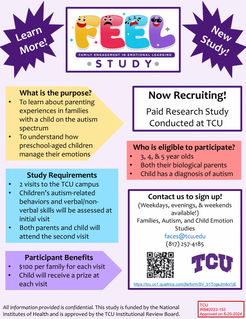 The purpose of this study is to better understand how autistic preschoolers regulate their emotions during different situations. Parents play a critical role in shaping early emotional development and we are also interested in how parents influence their children’s emotion regulation.