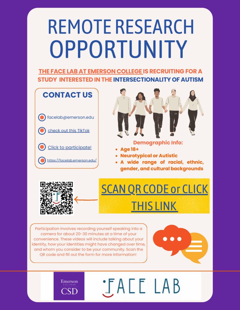 Everyone’s experience with autism is different, and we want to learn more about yours! We are asking you to submit videos of yourself telling us about your journey to diagnosis and how that journey has been shaped by all aspects of your identity. We want to learn more about how autism and other aspects of your identity, such as gender, race, and ethnicity interrelate and change overtime. Your videos will be used to analyze communicative strategies and patterns as well as give insight to the intersectionality of racial, ethnic, gender, cultural, and neurotype identities.