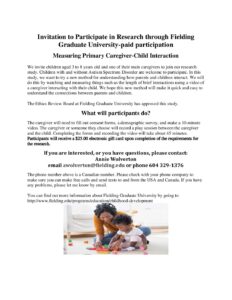 The caregiver will need to fill out consent forms, a demographic survey, and make a 10-minute video. The caregiver or someone they choose will record a play session between the caregiver and the child. Completing the forms and recording the video will take about 45 minutes.