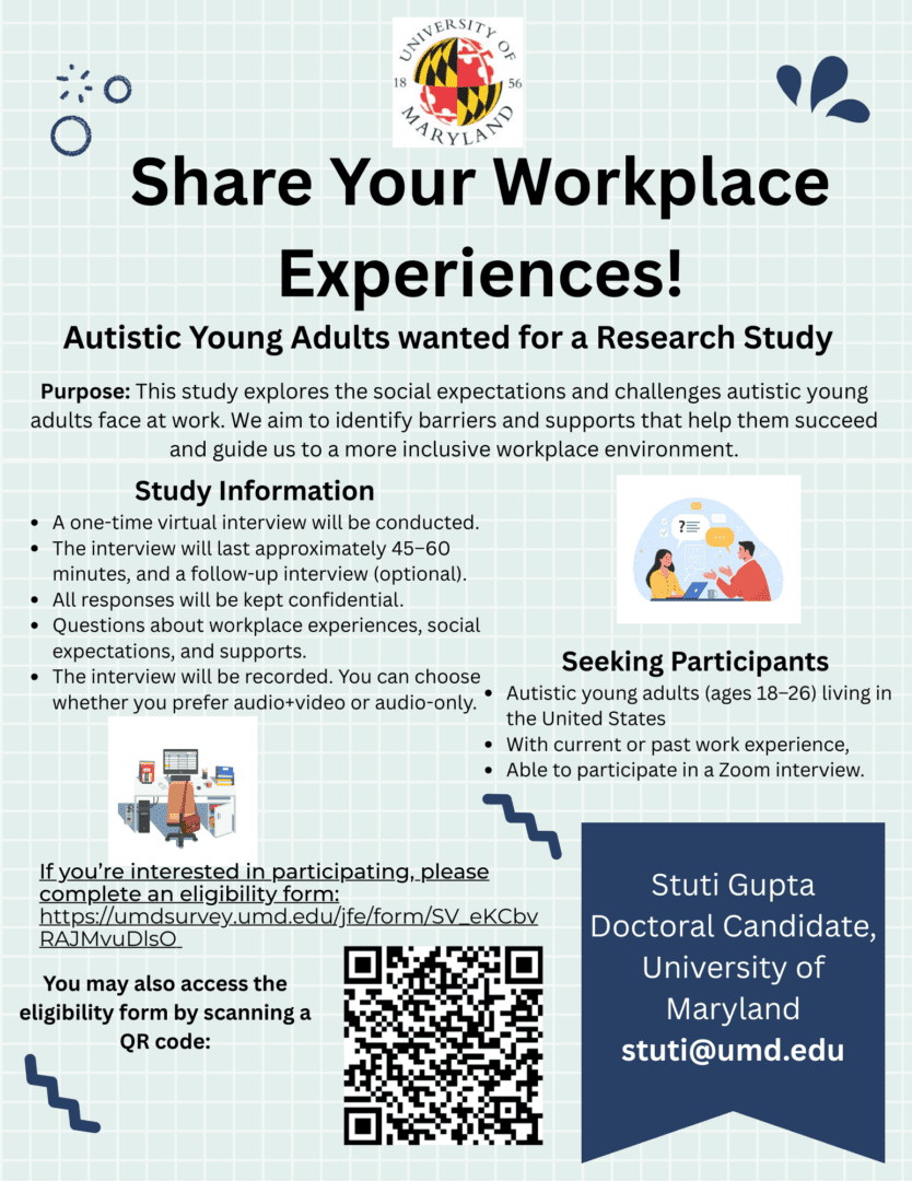 Additionally, the study will explore how support mechanisms such as workplace accommodations, training programs, and social communication aids influence autistic young adults’ ability to manage workplace interactions and succeed in their professional roles. By centering the lived experiences and perspectives of autistic individuals, this research aims to generate insights that can inform the development of more inclusive workplace practices, supports, and training programs. Ultimately, the findings may help educators, employers, and service providers better understand how to support autistic young adults in achieving and maintaining successful employment.