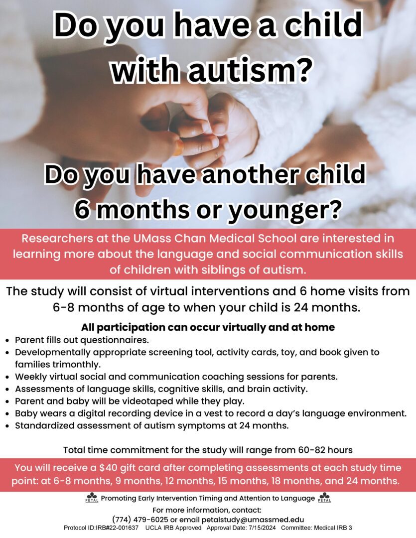 Researchers at the UMass Chan Medical School are interested in learning more about the language and social communication skills of children with siblings of autism.