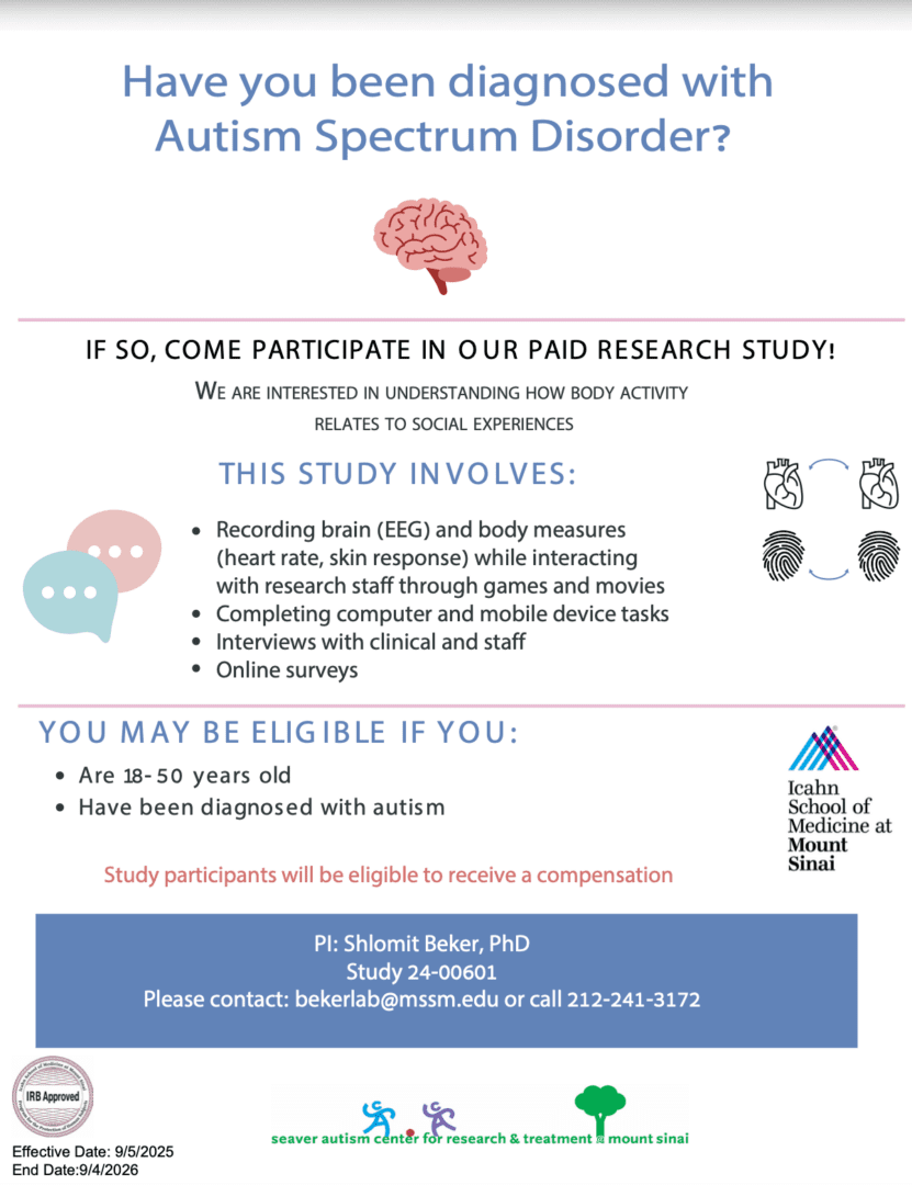 Participation includes a brief phone screening (~15 minutes) and confirmation of diagnosis to determine eligibility. Eligible participants will then complete two in-person sessions at The Seaver Autism Center (4 hours total).