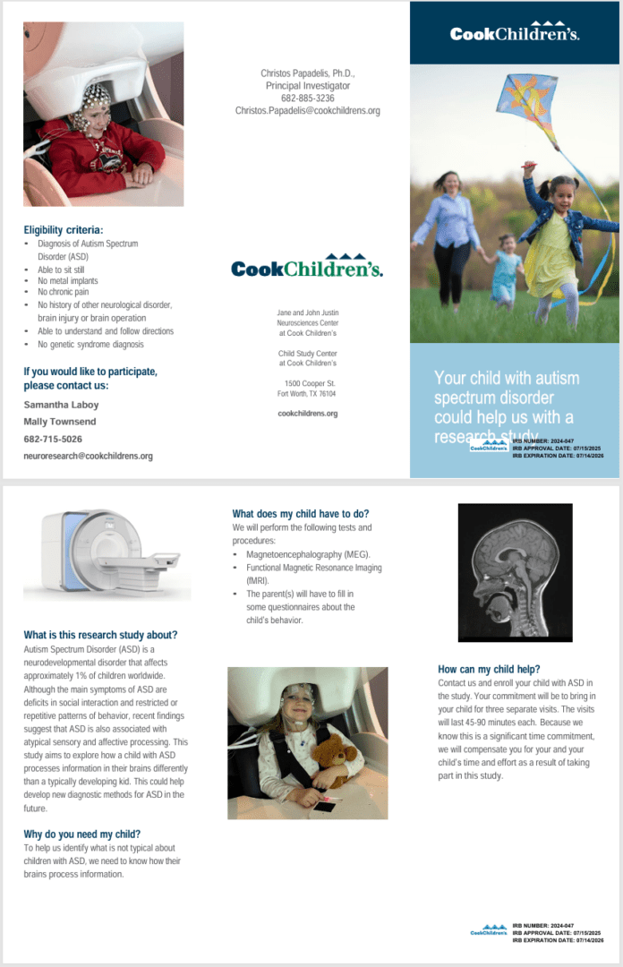 Cook Children’s Neuroscience Research Center in Fort Worth, Texas is recruiting children ages 3-19 diagnosed with, and also without, autism spectrum disorder to participate in a brain imaging research study! Study Details: