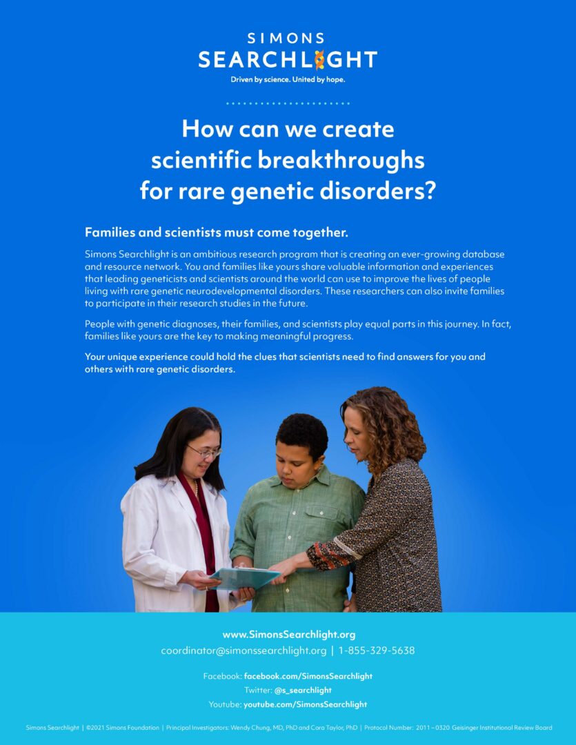 Simons Searchlight is an online international research program, building an ever growing natural history database, biorepository, and resource network of over 175 rare genetic neurodevelopmental disorders. By joining our community and sharing your experiences, you contribute to a growing database used by scientists worldwide to advance the understanding of these conditions. Through online surveys and optional blood sample collection, we gather valuable information to improve lives and drive scientific progress. Families like yours are the key to making meaningful progress.