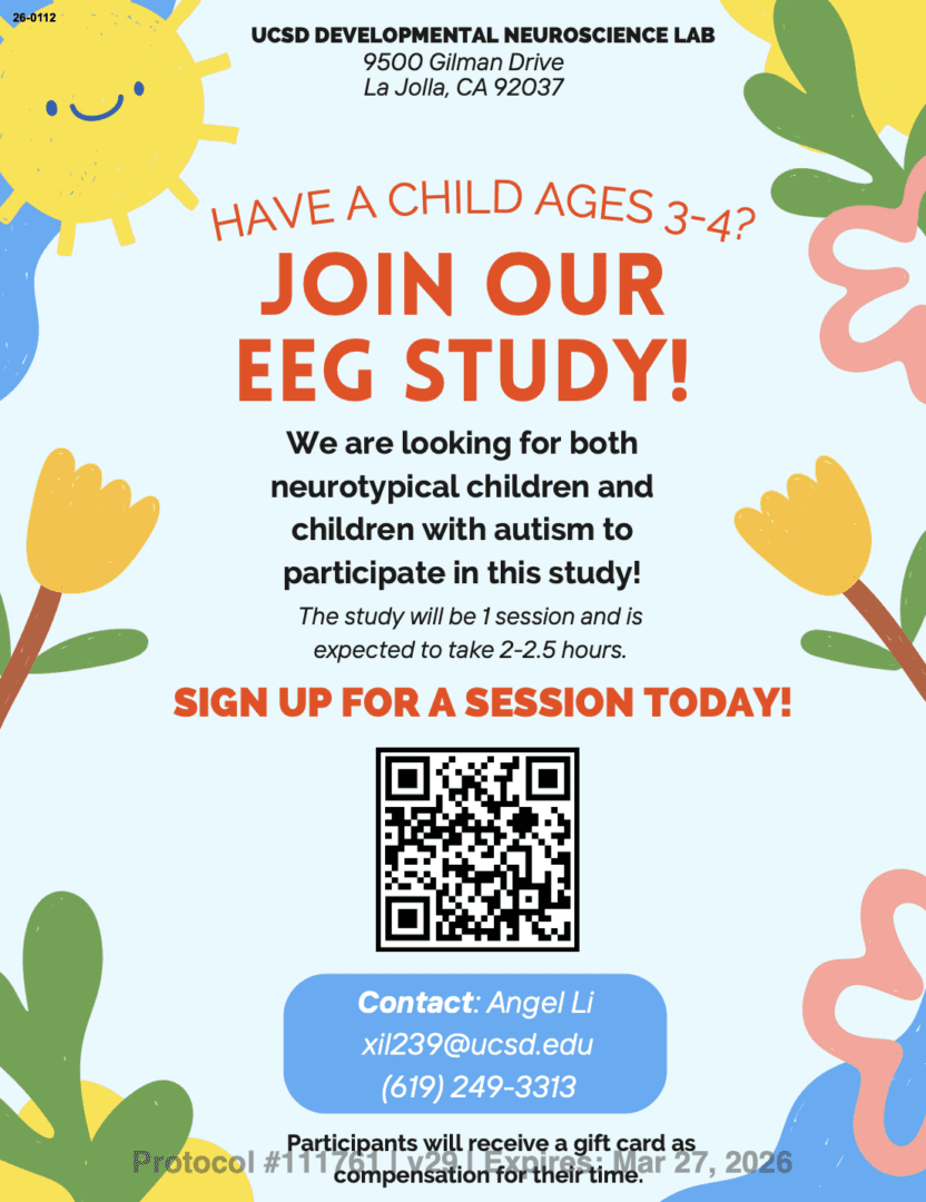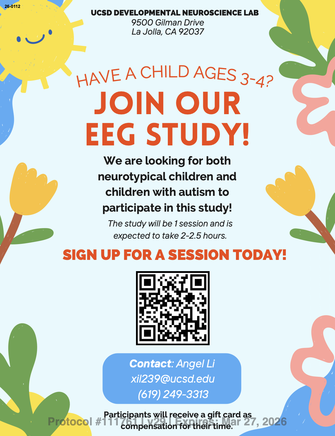 This study investigates whether differences in social reward processing help explain social and communication differences in children with Autism Spectrum Disorder (ASD). Specifically, it measures a brain signal called Stimulus Preceding Negativity (SPN), an Event-Related Potential (ERP) component that reflects anticipation of reward—to compare how children with ASD, typically developing children, and infants at familial risk for ASD respond to upcoming social (e.g., smiling faces) versus nonsocial (e.g., objects) stimuli. The study tests the social motivation hypothesis, which proposes that reduced sensitivity to social reward contributes to later social difficulties in ASD. In addition, the project examines whether early language mechanisms (such as the shape bias in word learning) relate to relational reasoning abilities in preschoolers. By combining neural (EEG/ERP) and behavioral measures across infancy and early childhood, the study aims to understand how early reward processing and language development contribute to cognitive and social development in ASD.