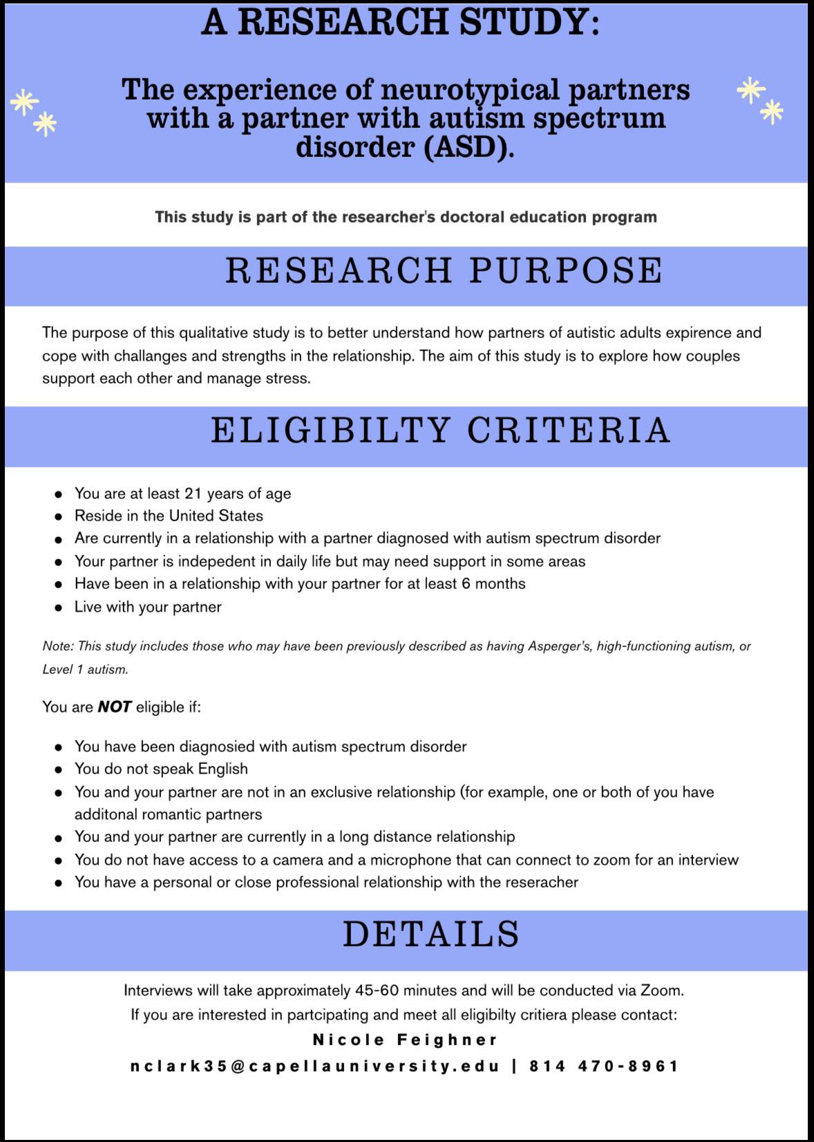 The purpose of this qualitative study is to better understand how partners of autistic adult’s experience and cope with challenges and strengths in the relationship. The aim of this study is to explore how couples support each other and manage stress. This study is part of the researcher’s doctoral education program