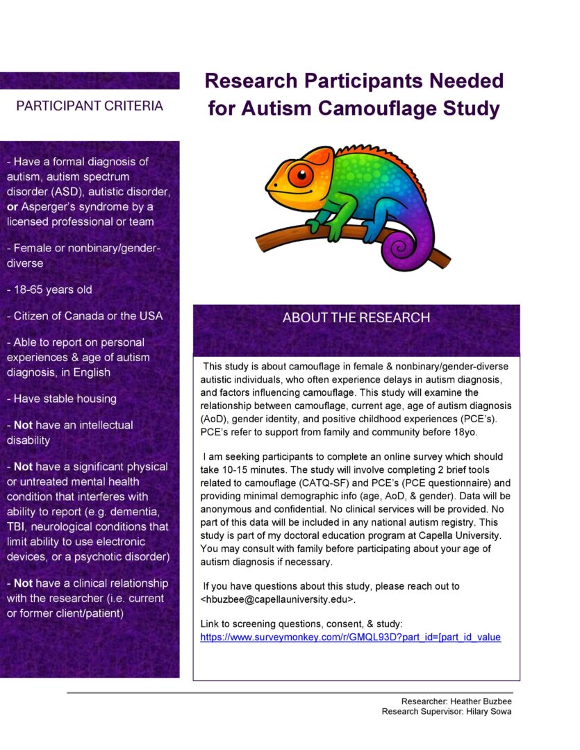 This study is about camouflage in female & nonbinary/gender-diverse autistic individuals, who often experience delays in autism diagnosis, and factors influencing camouflage. This study will examine the relationship between camouflage, current age, age of autism diagnosis (AoD), gender identity, and positive childhood experiences (PCE’s). PCE’s refer to support from family and community before 18yo.